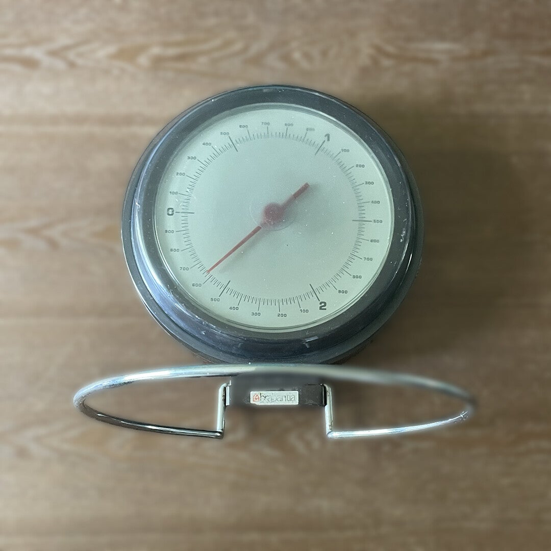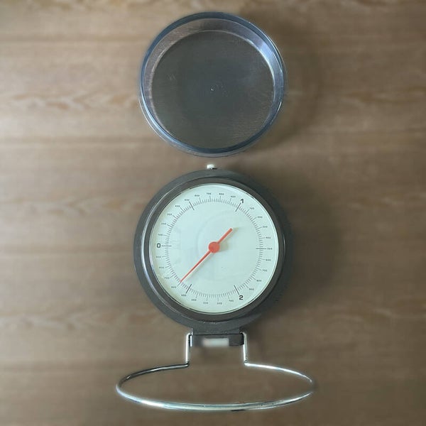 This 1970's vintage functional scale is compact and easy to use. The scale dish can be taken off the holder for easy washing. It all folds up nicely to keep out of the way when not is use.