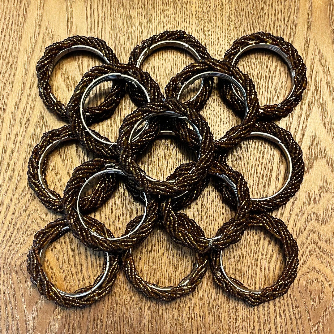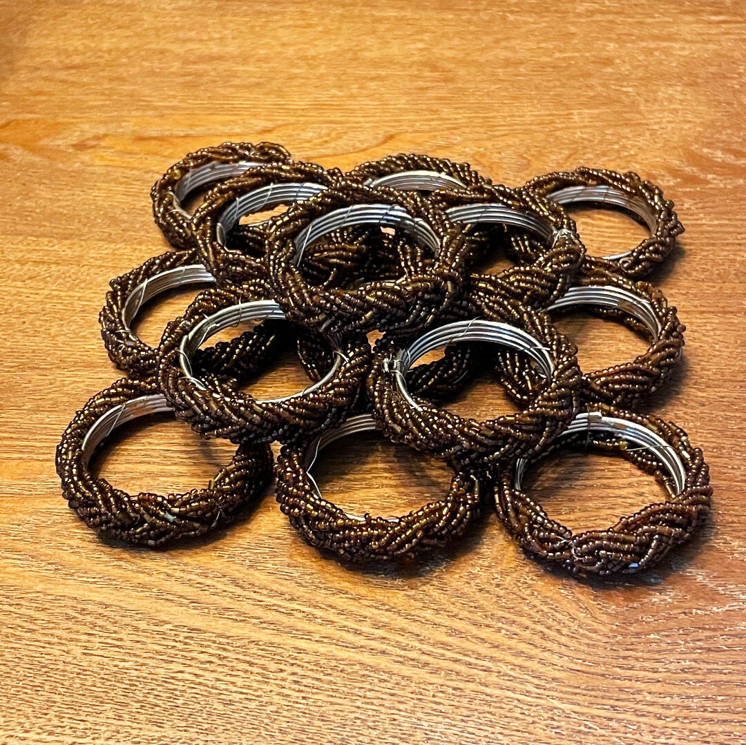 Hand braided w/ brown glass beads and wired around metal napkin rings.