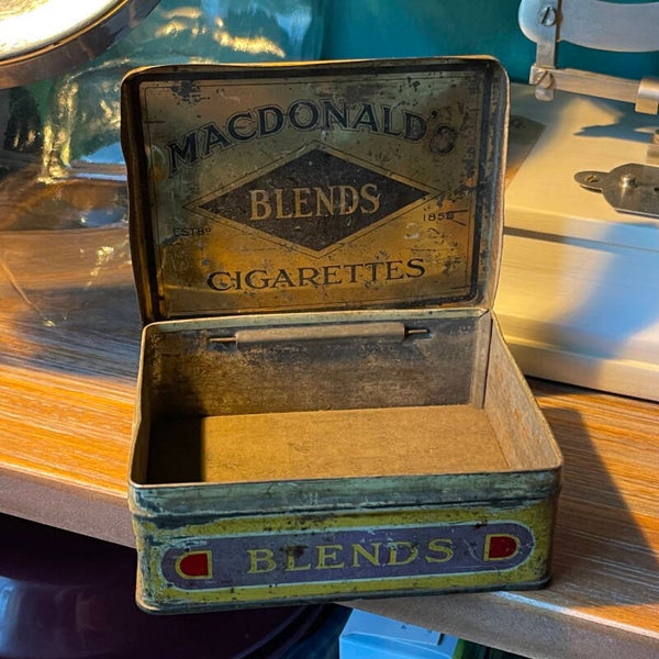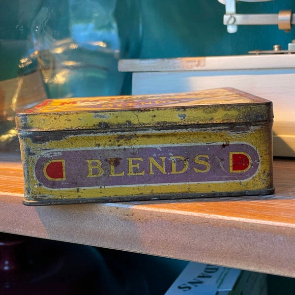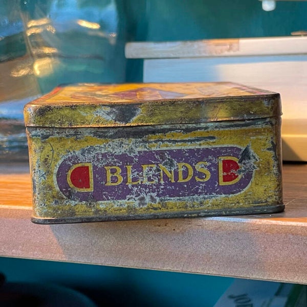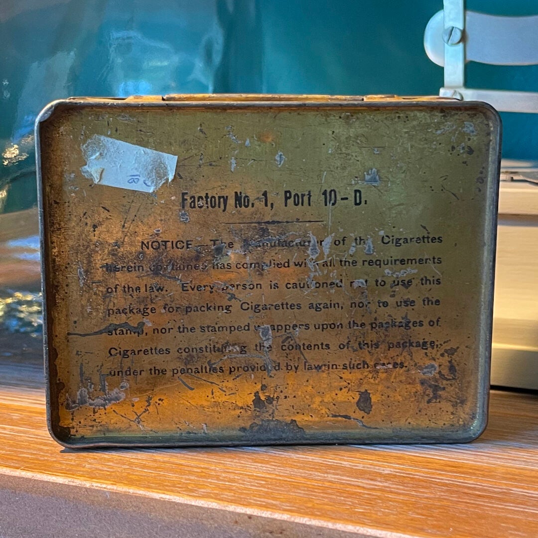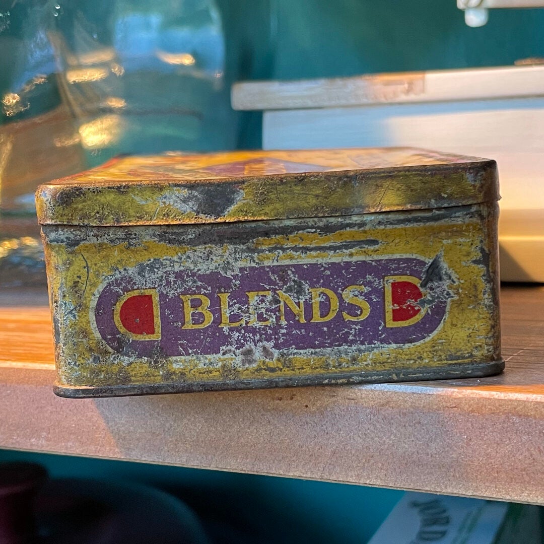 This vintage tin has some dings, wear & tear reflective of the age of the tin.