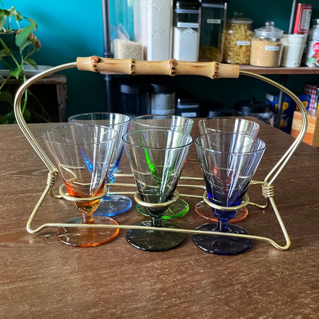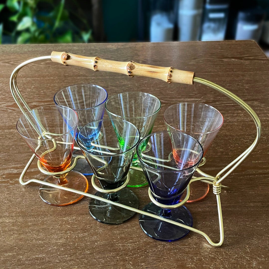 Metal wire holder w/ embellished bamboo handle. Each glass is a different colour. Mint condition.