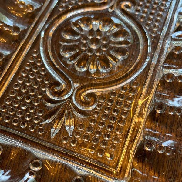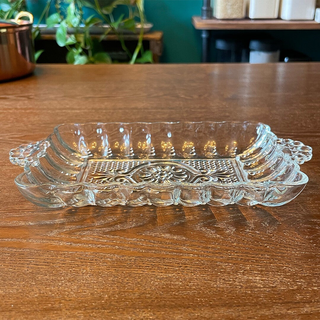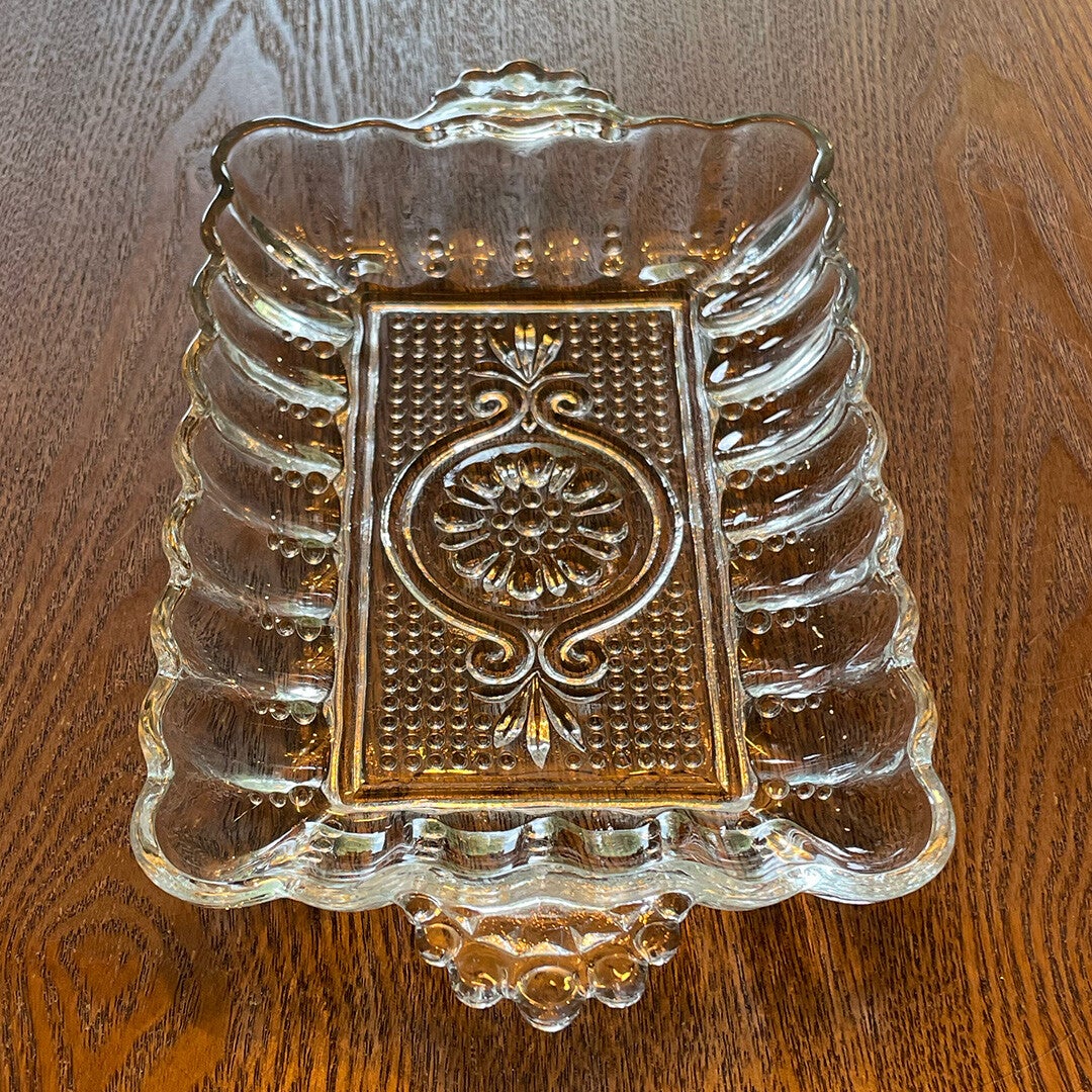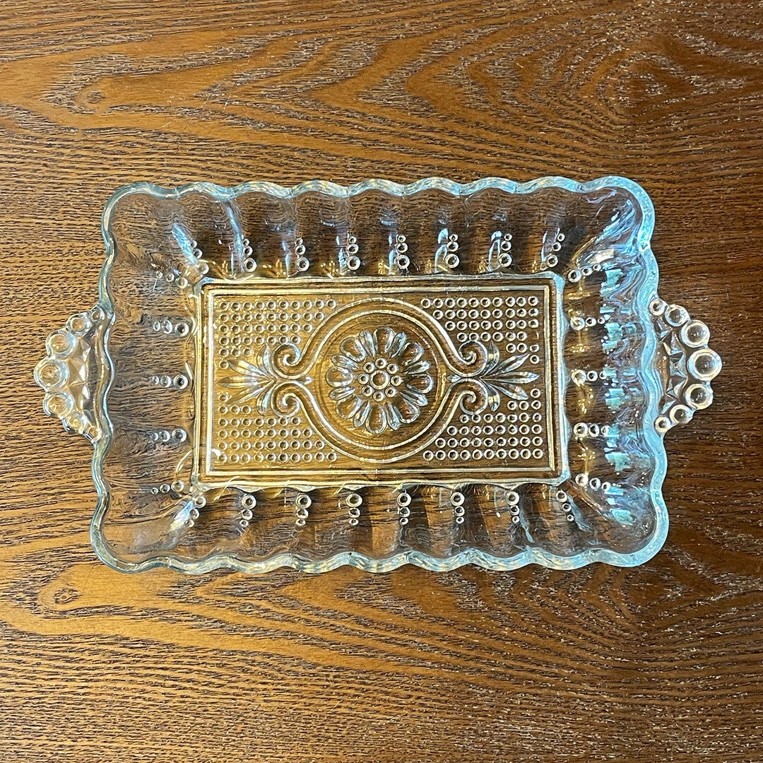 This elegant tray w/ beaded handles is a pretty touch on your table. Perfect for pickles to earings!