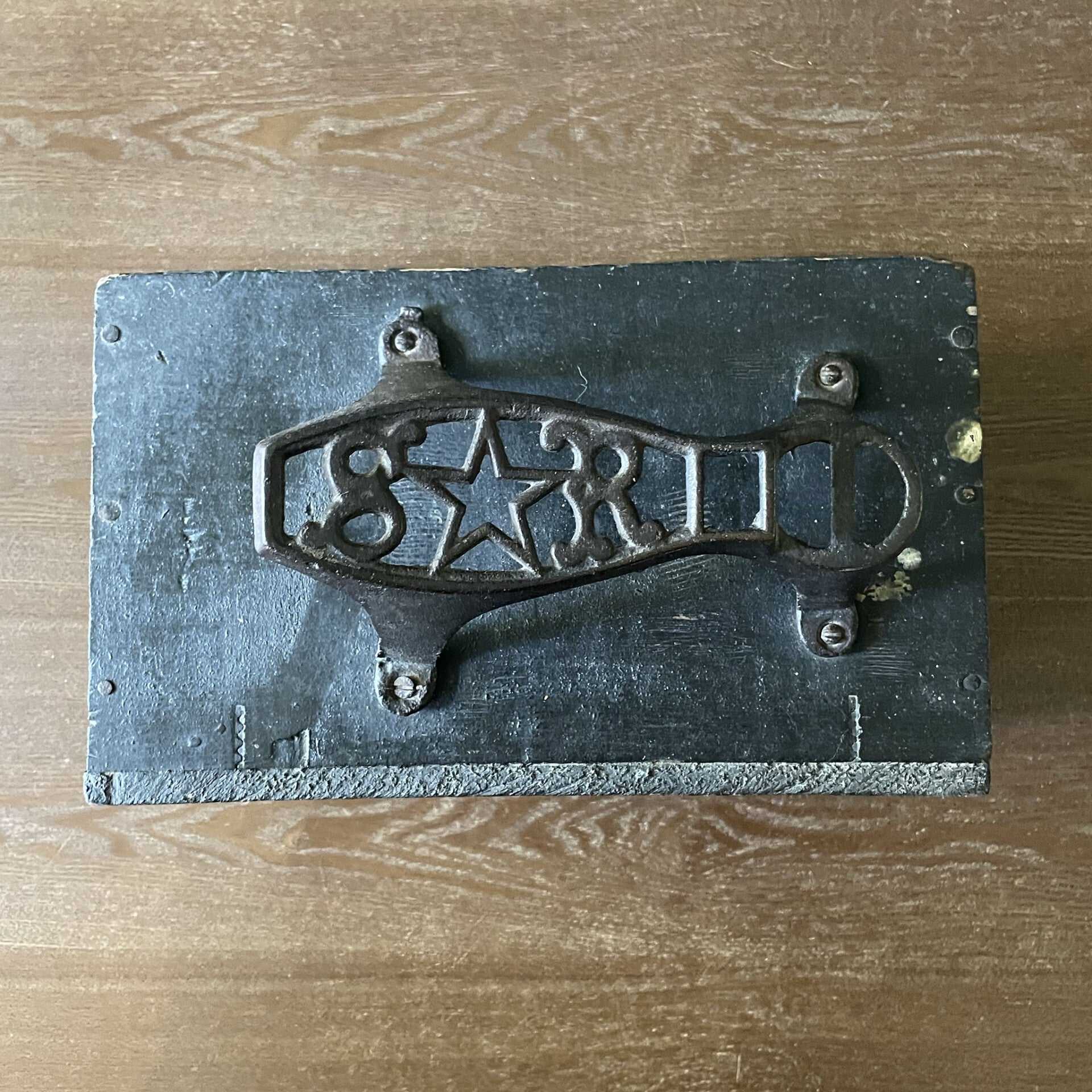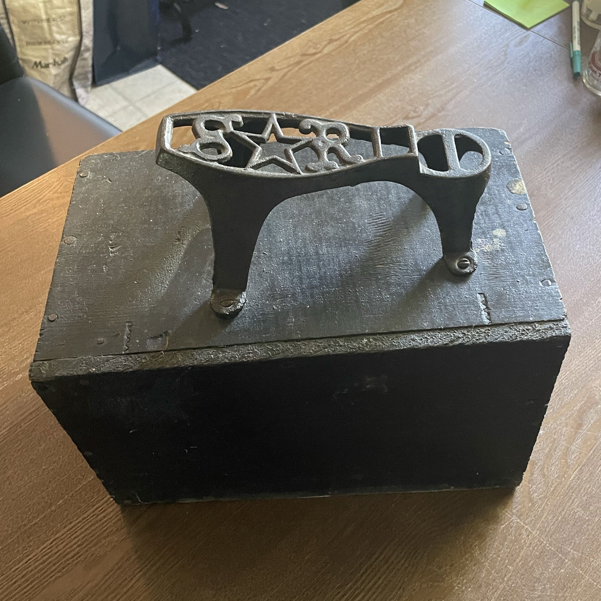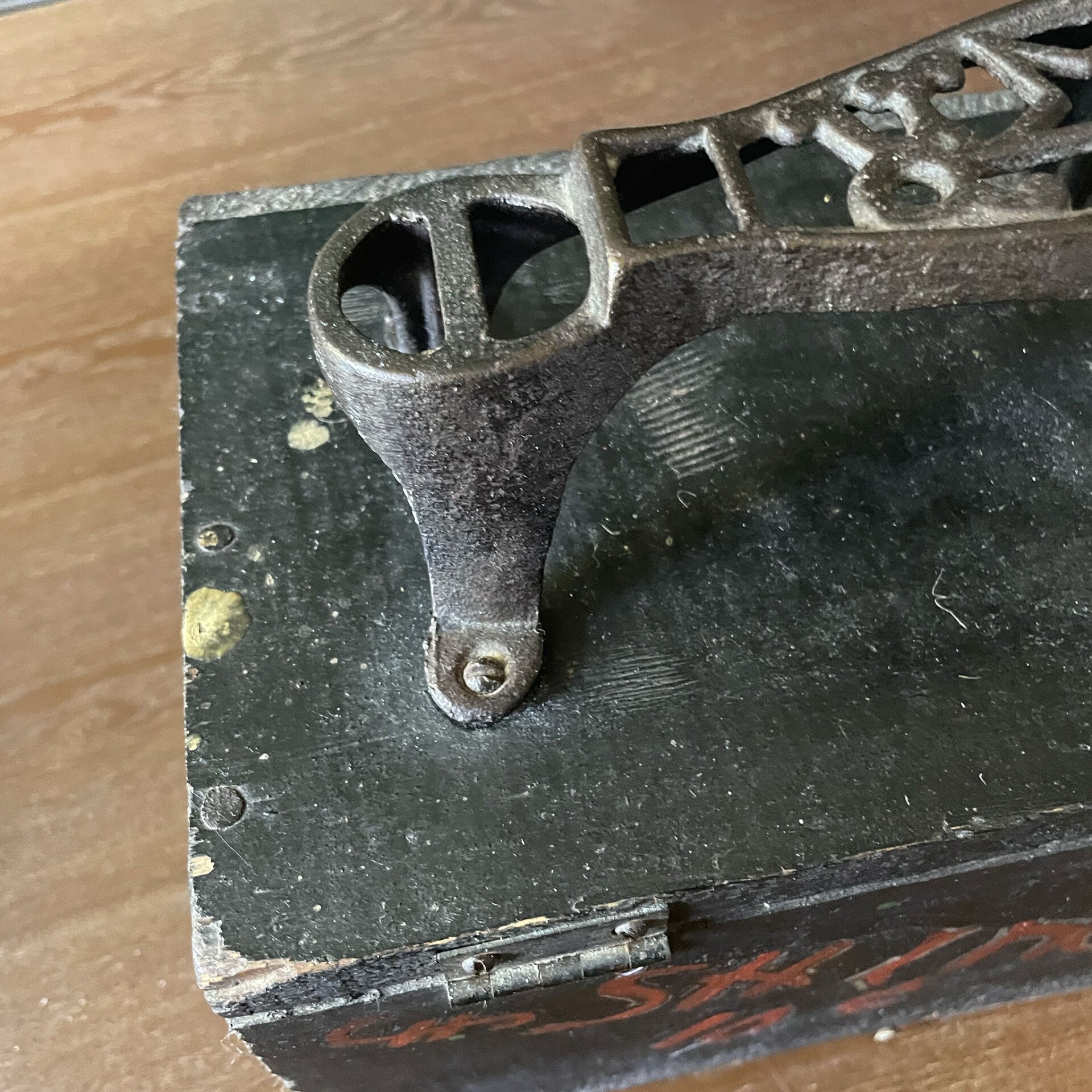 This wooden shoe shine box from the Vintage Depression Era features a painted "Shine 10 cent" symbol on the flip lid of the empty box. It also includes a cast iron footrest with a GR Star design.