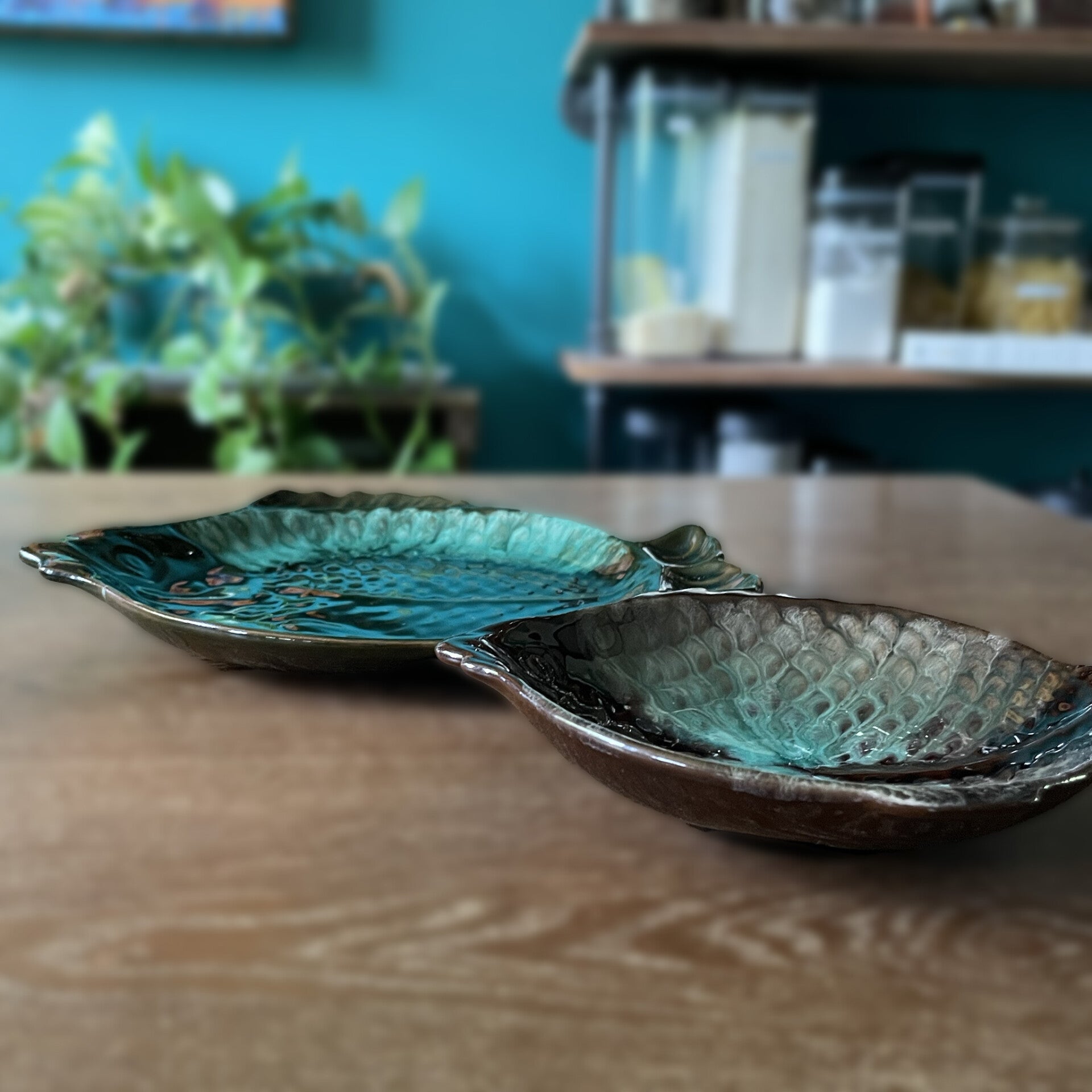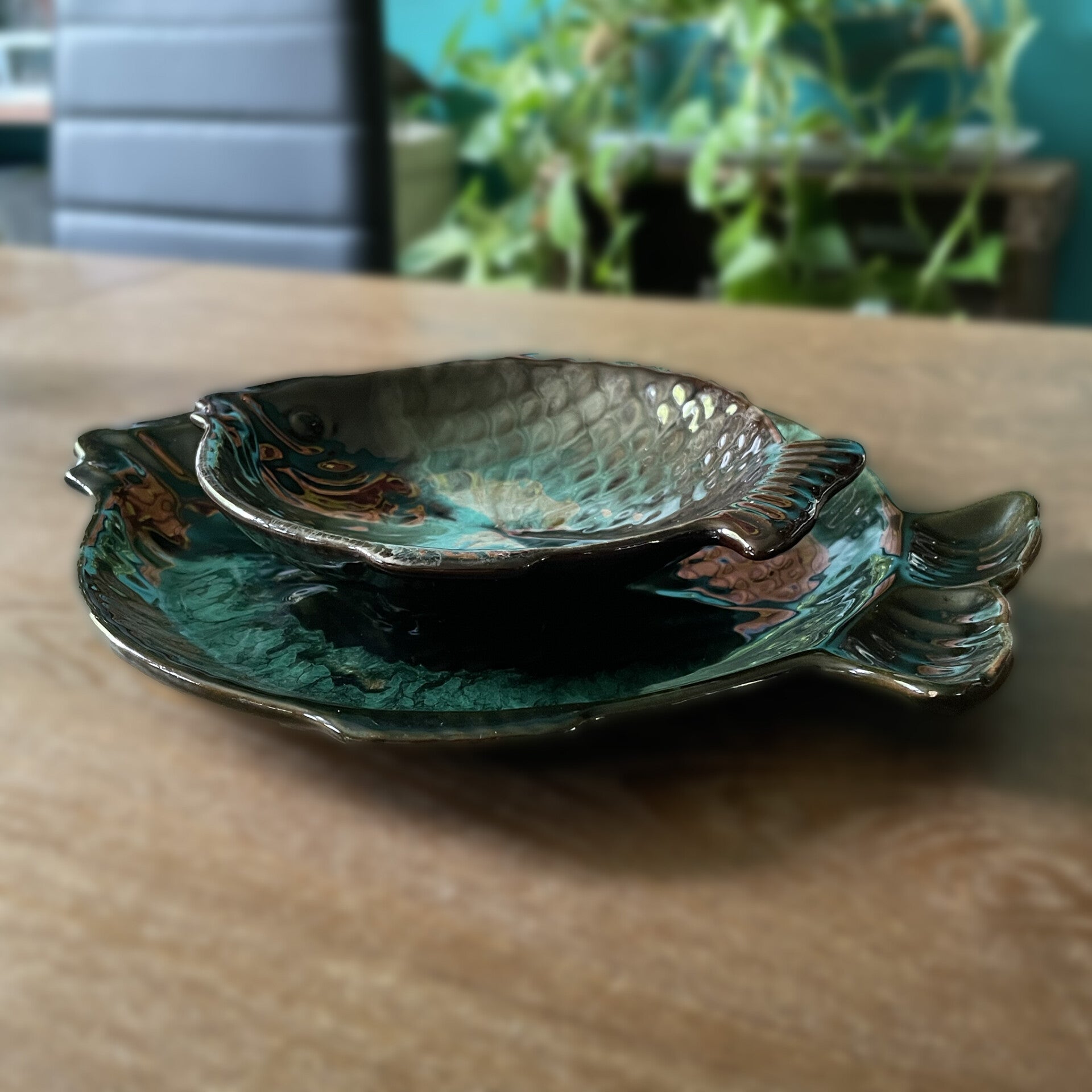 Blue & Black Pottery Fish Shaped Platter & bowl