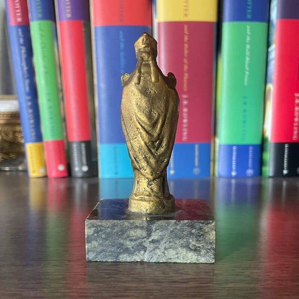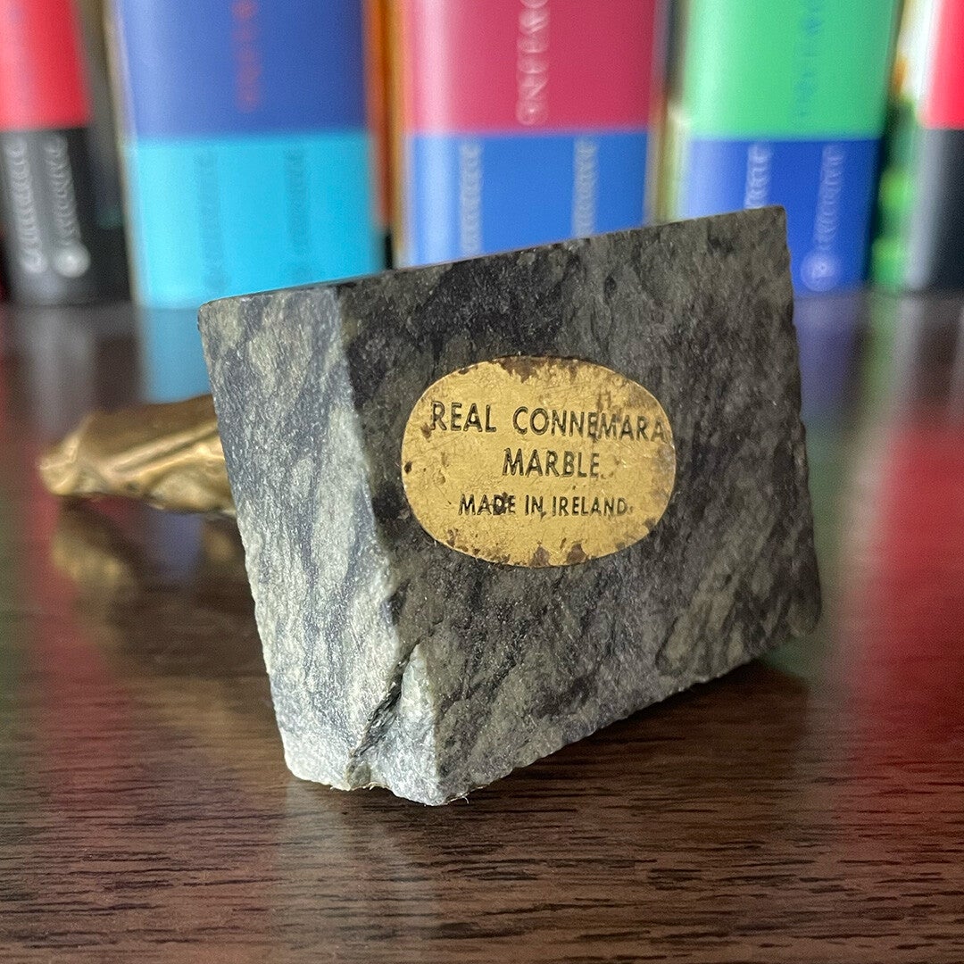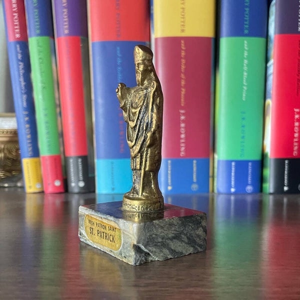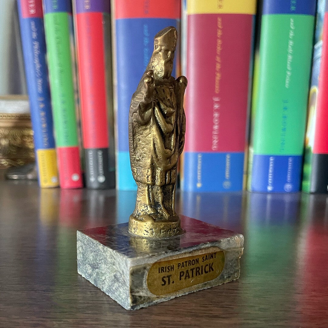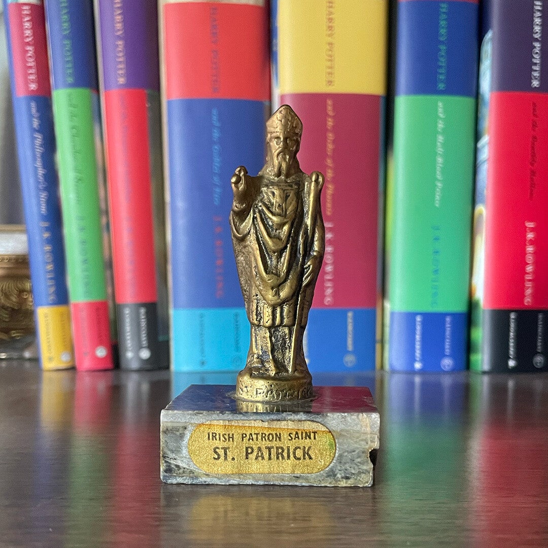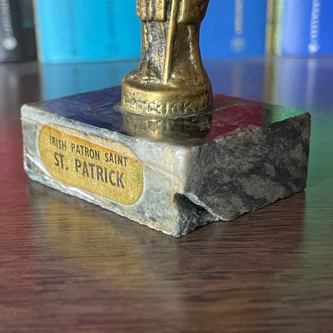 Rare tiny Irish statuette of St. Patrick. Bronze, on a real Connemara Marble Base. Made in Ireland.