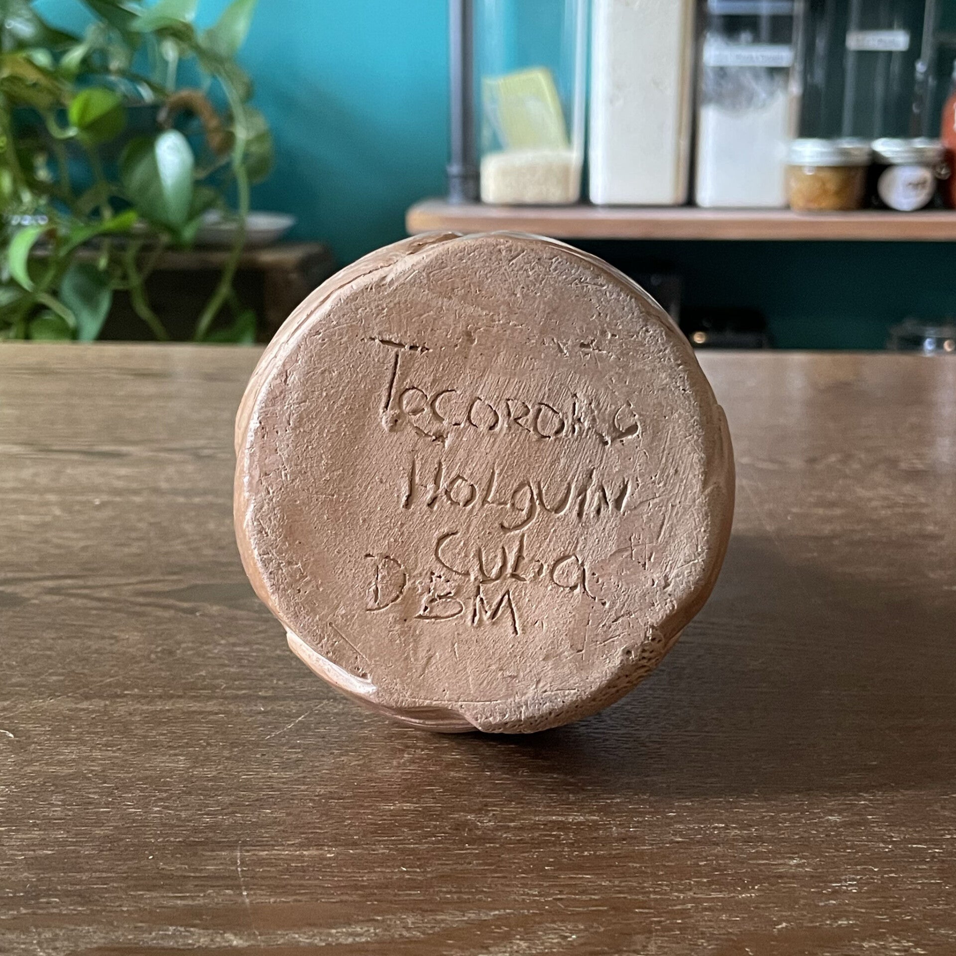Handcrafted in Cuba, this signed clay vase features beautifully carved leaves.